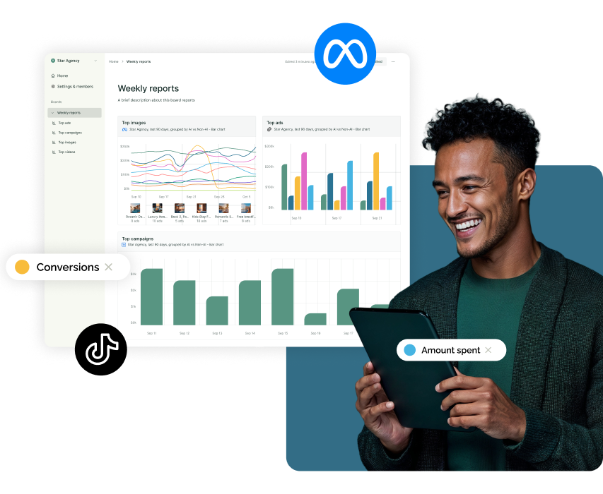 Superads currently integrates with Meta, TikTok, LinkedIn and YouTube. You can analyze multiple channels and accounts from a single report and board